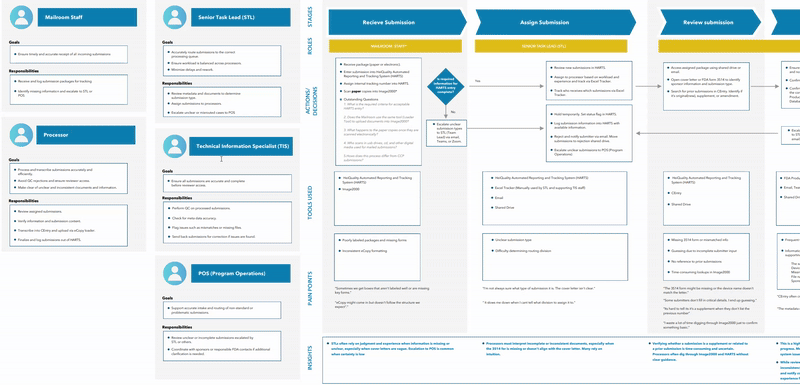 This journey map helped identify key friction points and manual steps that could be improved if upstream submission forms (like SBD) were designed with those needs in mind.